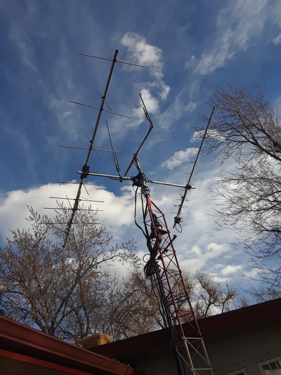 this consists of a short 15' tower with a 7 element 2mtr and a 9 element 70cm yagi cross polarized antennas mounted to a Yaesu G5800 rotator and comes with cabling and some info doc's. It comes with a Yaesu controller and a Fox Delta ST3 computer interface. Also comes with 2 extra 10' tower sections. As is, where is, (you need to disassemble it)